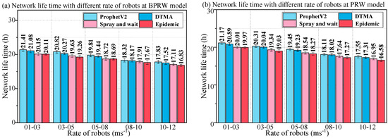 Results of Scenario 3, Network life time with different rate of robots. (a) BPRW movement model; (b) PRW movement model.