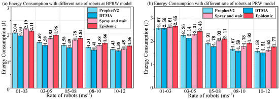 Results of Scenario 3, Energy consumption with different rate of robots. (a) BPRW movement model; (b) PRW movement model.