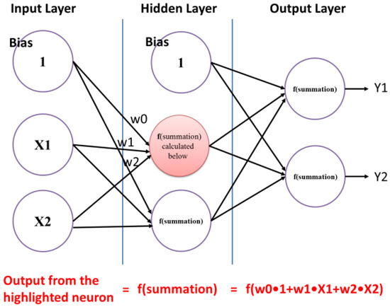 Hidden layer: The hidden layer also has three nodes. The offset node output is 1. The output of the other two nodes of the hidden layer depends on the output of the input layer (1, X1, and X2) and the weight attached to the connection (boundary). Figure 2 shows the calculation of an output in a hidden layer (highlighted). The output calculations of the other hidden nodes are the same. Please note that “f” refers to the activation function. These outputs are passed to the nodes of the output layer.
