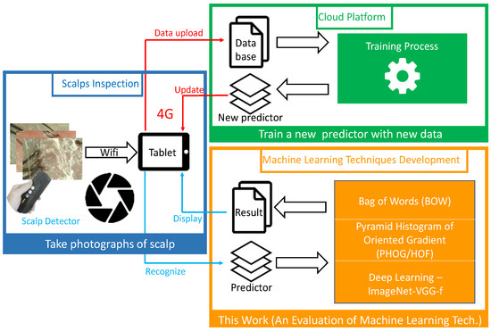 Figure 3 shows the system architecture of the intelligent scalp detection system (ISDS) [25]. The ISDS consists of a scalp detector, an app running on a tablet, machine-leaning techniques [2,26], and a cloud management platform. The scalp detector will be connected with the tablet through a Wi-Fi wireless network. Thus, a scalp photo can be captured via the scalp detector. The scalp photo will be taken by the scalp detector, and the recognized result of the scalp will also be sent and displayed to the tablet. Then, we can obtain quantitative data on scalps. Furthermore, based on ISDS, we will compare three state-of-the-art machine-learning methods using scalp image data: deep learning, BOW [27] with machine-learning classifiers, and PHOG [28] with machine-learning classifiers.