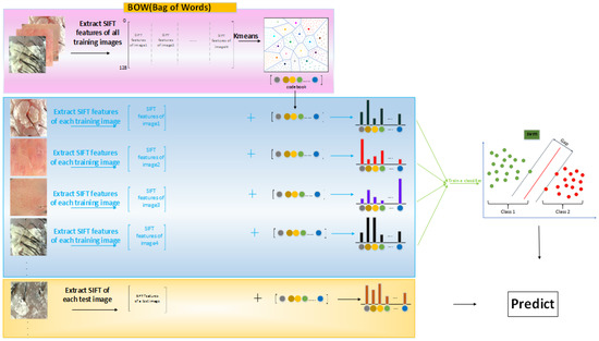 Figure 5 shows the second method, which is the combination of BOW and SVM. For the BOW, both the training and testing image features are obtained via the SIFT [30] method. Then, we use the K-means [31] method based on SIFT features to train the images to create a codebook. Histograms [32] are built according to the codebook produced for each test image.
