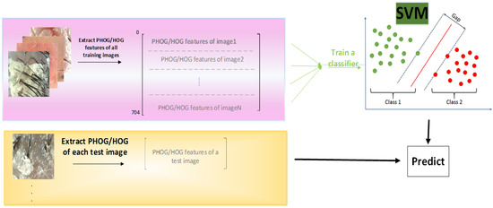 Finally, those histograms are used to train a SVM classifier, and the SVM classifier is used to predict the test image. The third method, which is shown in Figure 6, used a HOG algorithm to obtain the training and testing image features. This method trained a SVM classifier based on the HOG features of the training images.