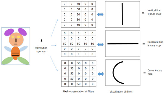 Convolution layers are usually composed of a wide range of filters as shown in Figure 8. Those filters can enhance the features of images. For example, the top of Figure 8 shows the pixel representation of a line filter. After convoluting input images with this line filter, a vertical line feature map can be obtained. Through a vertical line feature map, we can extract the line features included in those images. After several layers, the CNN can learn to grab more complex features, such as objects.