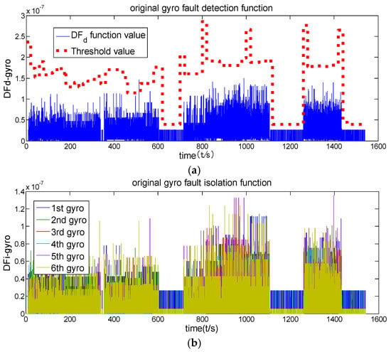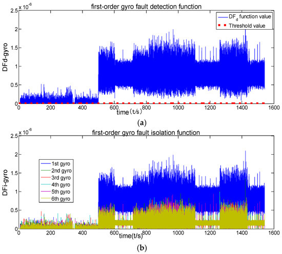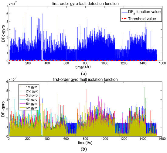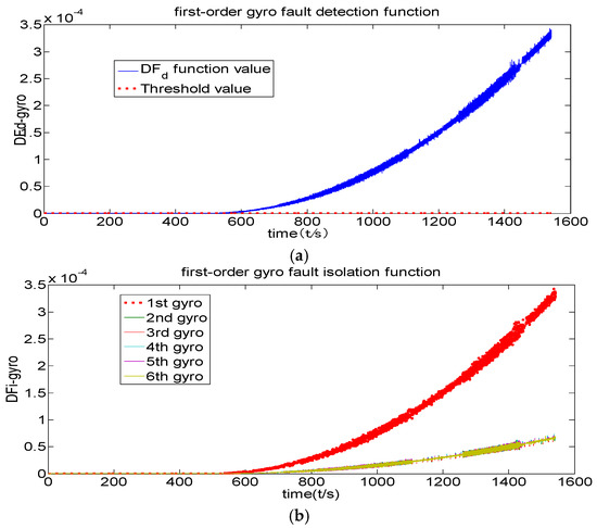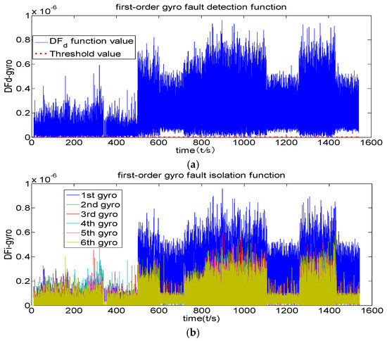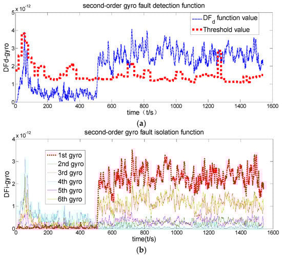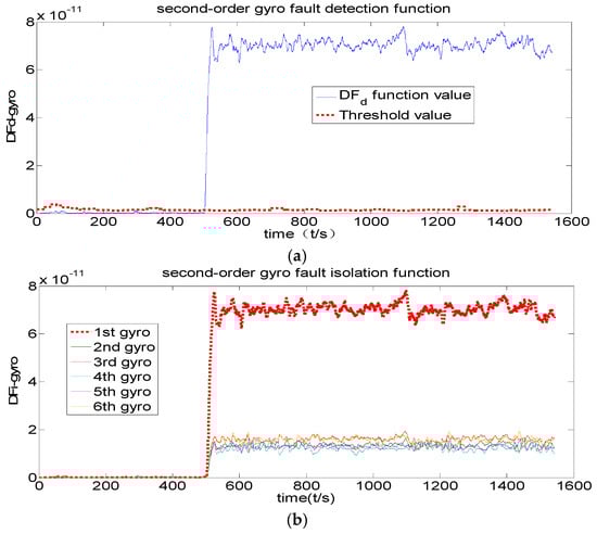 Figure 5 shows that the fault detection function of the original channel filter has never exceeded its threshold value, indicating that no fault has been detected. Figure 6 shows that the fault detection function exceeds the threshold value after 500 s, indicating that the first-order channel filter has detected a fault. Furthermore, its fault isolation function has been separated after 500 s, indicating that this channel filter is also able to isolate fault. Figure 6 also shows that fault is both detected and isolated correctly. The comparison of Figure 6 and Figure 7 indicates that the first-order channel filter’s detection delay time is relatively short but that its detection accuracy is not high (the curve is rougher). The second-order channel filter’s detection delay time is long but its detection accuracy (the curve is smoother) is high. Therefore, it is concluded that fault detection delay and detection accuracy are contradictory.