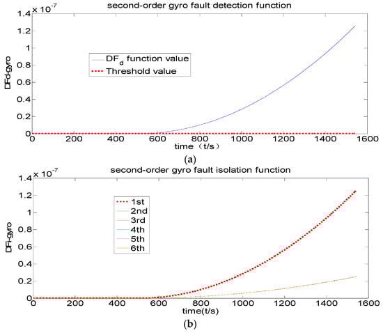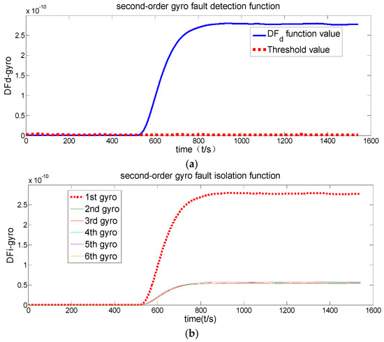 It is found that the ramp fault detection function of the original channel filter has never exceeded its threshold value in Figure 11, indicating that no fault has been detected. The Figure 12 shows that the fault detection function exceeds the threshold nearing 600 s, indicating that the first-order channel filter has detected a fault. However, its fault isolation function has been separated, nearing 600 s. Furthermore, Figure 13 shows that the fault detection function exceeds the threshold, also nearing 600 s, indicating that the second-order channel filter has detected a fault. Its fault isolation function has been separated nearing 600 s and the curve is smoother.