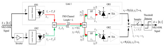 where denotes the electrical-to-optical conversion coefficient of i-th OS. Outputs of OSs are then passed through a beam combiner (BC) to ensure that both beams are transmitted over the L-length FSO channel. The optical signals at the Rx are given by