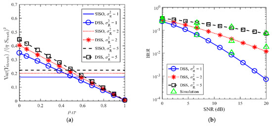 Finally, the combined effects of PE and moderate to strong turbulence on the variance of DTL as well as the BER performance are illustrated in Figure 6a,b, respectively. For these cases, we can observe that even DDS is not mitigating the cannel fading efficiently. Therefore, a designer might consider additional methods such as using a larger aperture to improve the system performance by aperture averaging. The plots show further degradation in both the variance of DTL and the BER compared to Figure 5. The same trend of the larger and the better BER performance of DSS are also seen in Figure 6b. In a strong turbulence regime, PE are less dominant than turbulence. In all variance of DTL plots, one can see that once the channels are highly correlated, the normalised variance of DSS is reduced to the normalised variance of noise with the value of ~0.06. Therefore, under a highly correlated turbulence channel with significant channel fading, it is highly advantageous to implement a DSS FSO scheme in comparison to a SISO one.