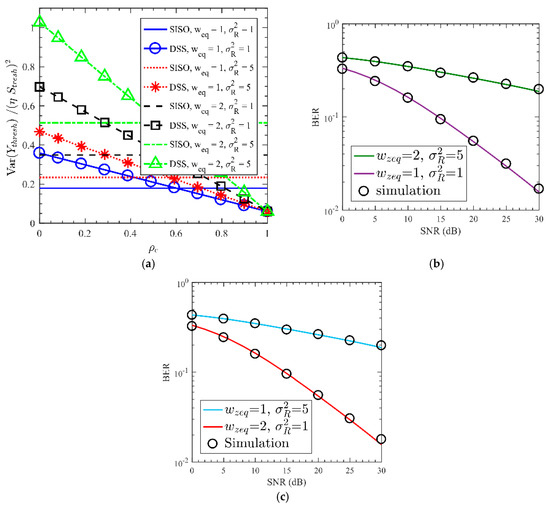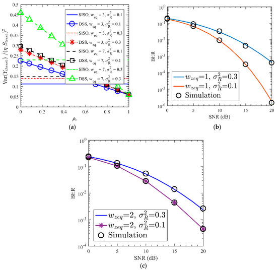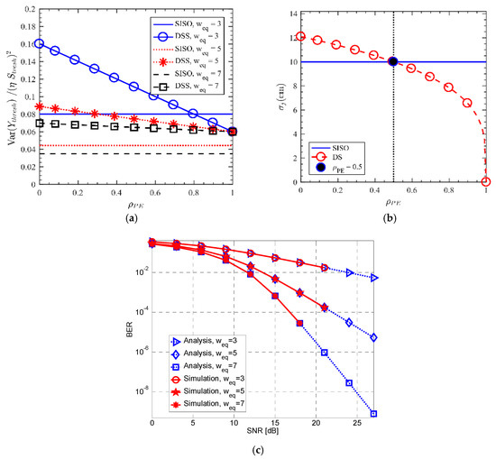Figure 4a depicts the variance of DTL versus the for both SISO and DSS links for a range of equivalent beamwidth . The plots display the same profile as in Figure 2a with DSS offering improved performance at more significant PE. The benefit of highly correlated DSS compared to the SISO link with the same is more outstanding when reduces. Smaller can be interpreted as the reduced effect of PE on the optical beam. Using the predicted from Label (29), the variance of equivalent DSS PE () can be determined for a range of . Figure 4b depicts the jitter standard deviation against for a SISO link and an equivalent DSS link with , , and . It is observed that the PE induced fading effect reduces with increasing value of . For instance, for an uncorrelated channel with , the normalised variance is ~0.16, whereas, in highly correlated channels, the normalised variance is reduced to ~0.06. Also from both Label (29) and Figure 4b and for we have . The predicted BER results against the SNR for a range of are displayed in Figure 4c showing a good match with the simulated data. Note that, for lower values of the SNR penalty is rather high for a given BER. For instance, at a BER of 10−2, the SNR penalty is ~14 dB for compared . Note that, in Figure 4c, the different SNR vales are obtained by varying the value of noise variance for .