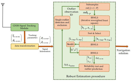A number of algorithms and methods have been proposed to improve the GNSS receiver performance in terms of the positioning accuracy. The geometric dilution of precision—(GDOP) based best satellite selection is one of the proposed methods [1,2,3,4,5]. The fundamental idea is to select a subset of observations having a minimum GDOP factor, though the rejection of a good observation can also lead to the minimized GDOP. Receiver autonomous integrity monitoring (RAIM) is another approach to reject outlier observations using pseudorange measurement redundancy to maintain the positioning accuracy by isolating the contaminated measurements from the good ones [6,7,8], and is primarily designed for aviation applications [9,10]. However, for user position estimation in urban environments, visible and available satellites are rapidly changing and it is difficult to use the RAIM for satellite/pseudorange selections. Besides the satellite/observation selection techniques, several researchers also focused to improve the estimation algorithms to enhance the positioning accuracy. Least-square estimators (LSE) has been used as the fundamental algorithm for GNSS positioning since the start [11]. LSE estimates the position of user by making a relationship between the unknown parameters and satellite to receiver geometry. However, it is assumed during LSE-based estimation, that the variance-covariance matrix of the observations, also called the dispersion matrix, is an identity matrix i.e., all the observations have same accuracy and are uncorrelated. On the other hand, real time GNSS observations have different level of accuracies depending upon the satellite elevation angle, signal strength and other radio interferences. Multiple algorithms and methods have been proposed to improve the GNSS positioning accuracy. WLSE (weighted least-squares estimation) schemes are proposed for calculating and assigning weights to the GNSS observations. In [12], authors proposed a WLSE (weighted least-squares estimator) where signal to noise ratio and observation variance are the weight model parameters. Tabatabaei [13] proposed a fuzzy weighted least squares method to enhance the GPS and the GLONASS (RUSSIAN GNSS) integrated navigation solution and 12 rules were defined based on the GDOP and the elevation angles of satellites for assigning weights to the GNSS observations. In [14], authors studied, tested and compared multiple weighing schemes for GNSS positioning relying upon the elevation angle and signal to noise ratio. In [15], two GNSS observation weighing models, sigma-elevation and CN0-elevation, are studied and compared by Sarab Tay. For the WLSE algorithms, satellite elevation angle and SNR (signal to noise ratio) are the primary focus of the researchers to compute the observation weights. However, relying on the elevation angle is not always useful because it is possible for the signal, from high elevation satellite, to be disrupted from the multipath and radio interferences especially in urban canyons. The concept of non-linear statistics (or robust statistics) has been also studied in literature by several researchers to improve the GNSS positioning accuracy. In [16], neural networks are used to improve the performance of least absolute and least-squares estimators for robust GNSS positioning. However, the primary disadvantage is the computational cost in addition to the outfitting problem. In [17], the concept of robust M-estimator is used to improve the performance for the GNSS positioning by calculating and adding the weight matrix during the innovation step. In [18] multiple robust statistical estimation techniques have been discussed including M-estimators, L1 estimators and genetic algorithm. The proposed estimation process in [18] determines a set of all possible solutions by using the minimum required number of satellites (e.g., in case of GPS, four satellites are required for positioning) using LSE. The median of remaining estimates is considered as the user position after removing possible wrong estimates and a genetic algorithm is used to minimize the estimation error. The fundamental problem for this scheme is the number of possible solutions. The addition of new constellations increases the number of available satellites for positioning in a single epoch and the number of solutions as well with the increase in computational cost. Secondly, the positioning process starts with an unknown random initial estimate such as a least-squares estimate and the iterative reweighting scheme can ignore perfectly good measurements resulting to a wrong convergence point with a bad initial estimate. Some researchers focused on the development of techniques to minimize the effect of noise parameters, such as ionospheric, multipath etc. In [19], authors introduced the concept of the adaptive carrier smoothing to attain an optimal carrier smoothing time to minimize the cost functions related to white noise multipath and correlated multipath errors. In [20], authors studied the application of DGNSS (differential GNSS) in smartphones for enhancement of the GNSS positioning accuracy in challenged environments. However the primary drawback for DGNSS-aided navigation is that a base station must be required for transmission of useful information and without this information host system is not able to maintain the required accuracy.