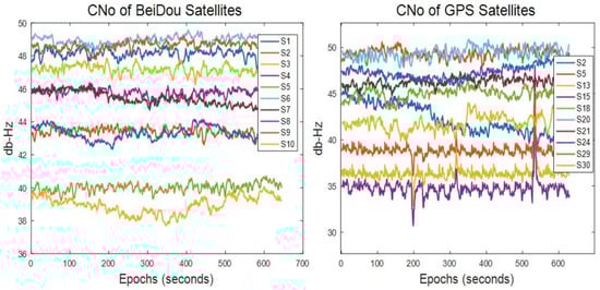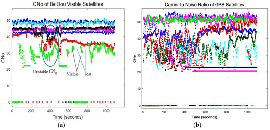 Carrier-to-noise ratio of visible satellites (a) BeiDou (b) GPS.