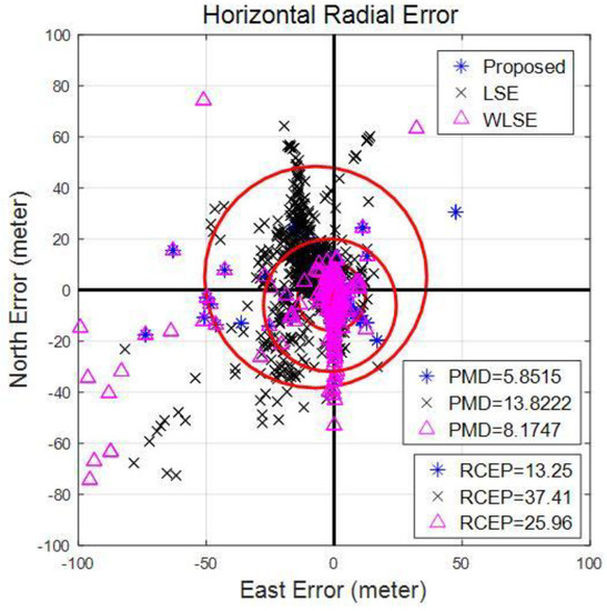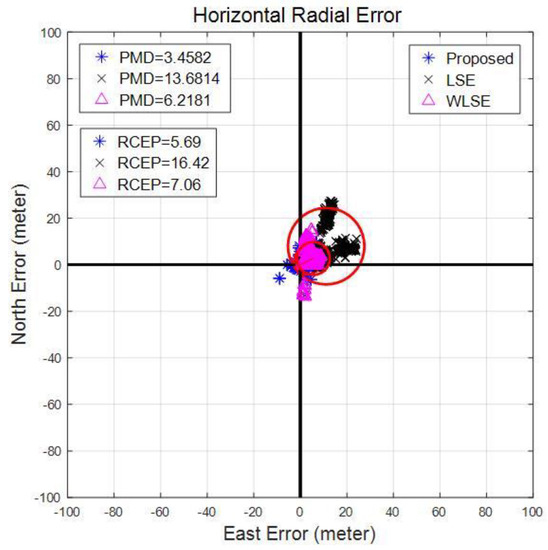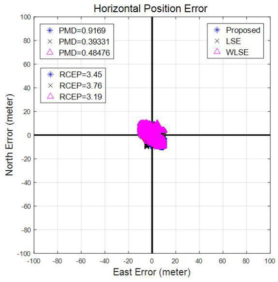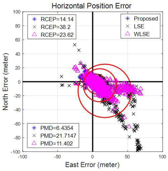 Horizontal radial error for open sky environment is shown in the Figure 4 in east and north error terms. There is a very little difference between RCEP of three models. However, PMD of the proposed scheme is larger than the other two schemes (except the difference is substantively small). The primary cause of better performance of LSE/WLSE is the presence of Gaussian white noise. As RCEP provides the 90% position error radius, results indicate that WLSE and the proposed schemes are more robust although the mean position error distance of LSE is smaller. Two additional simulations are also created by modifying the noise characteristics of observations.