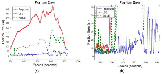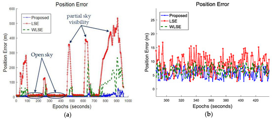 Figure 12a shows the errors in the estimated position from LSE, WLSE and our proposed algorithms. As described before, there are several open sky and partial visible sky regions, mentioned with arrows. In Figure 12b, position errors for open sky are zoomed. Estimated positions errors, for the duration of driving under trees, are showed in Figure 13. From Figure 11b, it is found that the performance of three algorithms is similar under (LoS) line-of-sight signal propagation conditions such as open sky. In LoS conditions, signals are biased with Gaussian-only white noise, hence LSE showed high positioning accuracy.