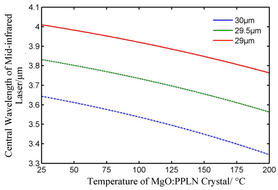 There is a certain relationship between the polarization period and temperature of MgO:PPLN crystal with the output wavelength of mid-infrared laser. The variation in the curve of the mid-infrared laser wavelength with the temperature of the crystal during polarization periods of 29 μm, 29.5 μm and 30 μm is shown in Figure 2. In our design, the wavelength of the mid-infrared laser was tuned by changing the temperature of the crystal. The MgO:PPLN crystal was fixed in the temperature control furnace, a film heater was used to control the temperature of the crystal and a PT1000 temperature sensor was used to measure the temperature of the crystal. We were able to obtain a certain wavelength from the mid-infrared laser by controlling the temperature of MgO:PPLN crystal at a specific value.