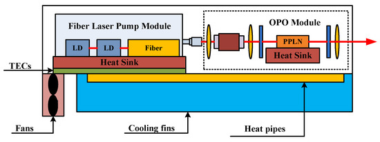 Recent studies of thermal management using TECs for lasers have mainly focused on single diode lasers with medium and low output powers, while high output power pump lasers always use the water cooling method to dissipate heat [11], which cannot satisfy the demand for miniaturization. In this paper, an all-fiber laser pumped optical parametric oscillator (OPO) laser was established with a compact thermal control system based on an automatic temperature control circuit, TEMs, cooling fins, axial fans and heat pipes. This thermal control system was designed and analyzed in finite-element method. A mathematical model to estimate the cooling capacity of the system under different ambient environments was established. Experiments in room and high temperature environments were carried out to validate the performance of the mid-infrared solid-state laser and the thermal control system.