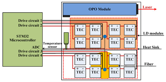 Each LD module was tightly fixed on the upper surface of a thin heat sink and fully contacted through grease. The fiber was encircled into a round shape and tightly pasted on the heat sink. The thin heat sink was made from molybdenum–copper material which has advantages of low density and high thermal conductivity. Thus, we were able to dissipate the waste heat generated from LD modules and fibers by cooling and keeping the upper surface temperature of the heat sink at a suitable value. A schematic diagram of the laser and thermal control system is shown in Figure 3.