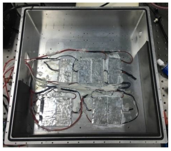 The TEM used here was MCTE1-12712L-S, manufactured by Multicomp (Warsaw, Poland) with parameters shown in Table 1. There were 16 pieces of TECs divided into 4 groups to cool the heat sink. Each group was made up of 4 TECs with two pieces electrically connected in series and then electrically connected in parallel together. As shown in Figure 4 and Figure 5, two groups of TECs in a line were used to cool the LD modules and the remaining two groups were used to cool the fiber. This electrical connection and configuration mode improved the heat transfer efficiency by increasing the contact area and simplified the circuit structure through one output channel to drive 4 TECs. The axial fan used here was a pulse width modulation (PWM) speed controlled fan with 24 V direct current (DC) power supply. The max rated speed of this fan was 18,000 r/min and the maximum airflow was 0.011 m3/s. There were 7 fans parallel connected in a line to increase airflow.