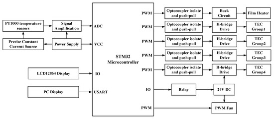 The main function of the system hardware circuit was to realize automated thermal control for the laser through exporting suitable drive power on the TECs. The diagram of the hardware circuit is shown in Figure 6. The circuit consisted of a STM32 microcontroller as control core, two PT1000 platinum resistor sensors to measure the upper surface temperature of heat sink, one PT1000 to measure the temperature of the MgO:PPLN crystal, an LCD12864 display to show the measuring temperature, setting temperature and operating state of the laser, a 24V DC power supply for the PWM fans, four H-bridges to drive the TECs, and a universal synchronous/asynchronous receiver/transmitter (USART) interface to communicate with a personal computer. The platinum resistor is a kind of temperature sensor with high stable performance and wide temperature measure ranging from −200 to +650 °C. The PT1000 temperature characteristics can be approximately expressed with the following equation: