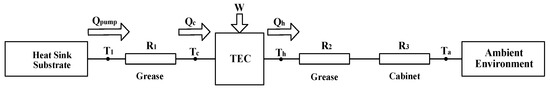 In order to estimate the performance of the thermal control system, a mathematical model of the system was established to calculate the cooling capacity. The thermal resistance network diagram is shown in Figure 7.