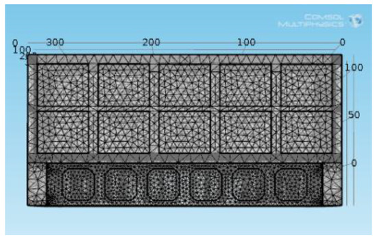The finite-element mesh model is shown in Figure 8 and the size unit of this model is in millimeters, the results for the temperature analysis of the model at ambient environment temperatures of 25 degrees and 45 degrees are shown in Figure 9, and the temperature units are degrees. It can be deduced that the highest temperature rise occurred at the left edge of the laser cabinet and with almost the same value at the different ambient temperatures. It is assumed that the two groups of TEMs were close to the left edge of the cabinet with the highest temperature at the hot side, since the simulated heat source was 500 W and the temperature rise was almost 20 K, thus the thermal resistance (R3) for the TEMs was 0.04 K/W. The other two groups of TEMs in the middle of the cabinet almost had a 15 K temperature rise at the hot side and the thermal resistance (R3) for them was 0.03 K/W.