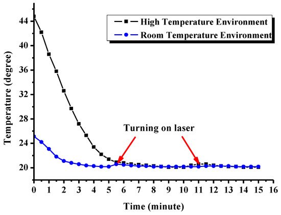 In the room temperature environment, when the electrical control unit was powered on, the thermal control system began to control the refrigeration of the TEMs to reduce the temperature of the laser. About 4 min later, the upper surface temperature of heat sink was reduced and stabilized at about 20.1 °C. Then the pump source was turned on and the laser began to output light. Since the pump source generated heat and transferred it to the heat sink, the temperature rose to about 20.6 °C. The temperature control circuit acquired rose in temperature and calculated the PWM control variable based on the PID algorithm. Then the output voltage exerted on TEMs was increased appropriately and the cooling output was amplified. About 1 min later, the temperature was reduced and stabilized at about 20.1 °C. The temperature variation of the pump laser over time is shown in Figure 11.