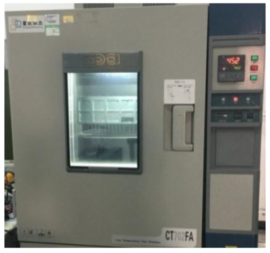 In the high temperature experiment, the mid-infrared OPO laser was put in the high and low temperature test boxes, as shown in Figure 12, and the environment temperature was set to 45 °C. About 10 min after the electrical control unit was powered on, the temperature was reduced and stabilized at about 20.1 °C. Then, the pump source was turned on and the laser began to output light, and the temperature rose to about 20.7 °C. About 1 min later, the temperature was reduced and stabilized at about 20.1 °C, as shown in Figure 11.