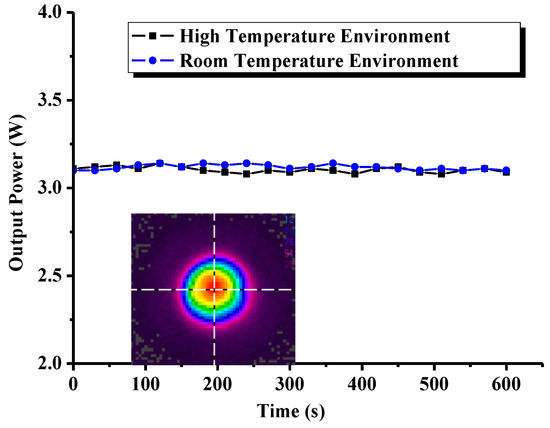 The output power variation of the mid-infrared OPO laser with 70% maximum pump power in room and high temperature environments is shown in Figure 13. The near-field pattern of the OPO laser at room temperature was also measured and is shown in Figure 13. The following formula was used to calculate the output power stability (S) of the OPO laser: