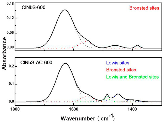 IR spectra for acidity analysis by pyridine adsorption on ClNbS-600 and ClNbS-AC-600 catalysts.