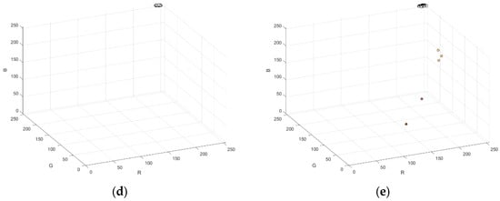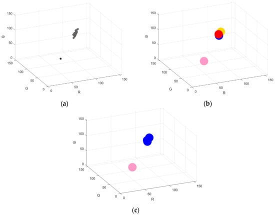 Given that the background color does not change in a short time, when , this position is represented as a color class similar to the input pixel . If the probability of the occurrence of is higher, it is more likely that input pixel is the background. However, the background will be subject to varying degrees of disturbance depending on image quality in a real environment, as shown in Figure 2a. If the degree of color disturbance is greater than the color difference threshold , then the background colors cannot be classified in the same category. As shown by the color classification results in Figure 2b, the color distribution at the upper right cannot fall into a single-color category. In addition, the color category established by the color distance classifier has a spherical color-distribution range with a radius of , while the distribution of background colors is irregular depending on the camera quality, as shown in Figure 2a. The increase of alone will cause large color errors in the background category. Therefore, a joint category approach is proposed to adapt to the irregular color distribution of a real background. The method for color-category information updates used in this study, as shown by Equation (6), will cause the position of the established color category in the RGB color space to change with the change of the input image, thereby causing some color categories to overlap in the color distribution ranges. In this study, the color categories with overlapping color-distribution ranges were considered to belong to the same joint category as shown in Equation (7), where represents the mth joint category. Since the color distribution range of a joint category will be arbitrarily extended depending on the color category, it represents the irregular color distribution of a real background, as shown in Figure 2c.