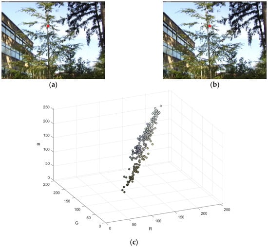The color change of a video series at the sampling position (72, 38): (a) the first input image, (b) the 250th input image, with the red dot on the diagram representing the sampling position, and (c) color distribution of the first to 250th input images.
