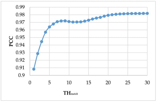 represents a perceived color difference. In all our tests, = 75 generated the best detection results. In order to determine the optimal , we monitored the change in PCC at different values in images detected with the EBBE method. As shown in Figure 6, generated satisfying PCC results, while the computational cost of the algorithm increased with the increase in . Therefore, we decided that the optimal setting is .