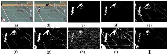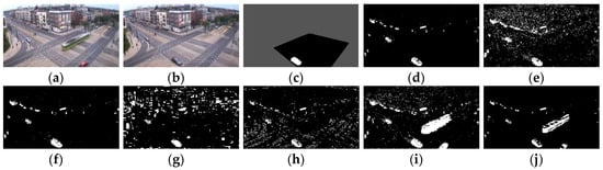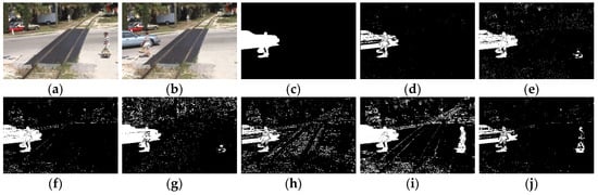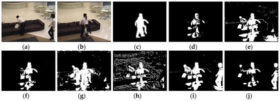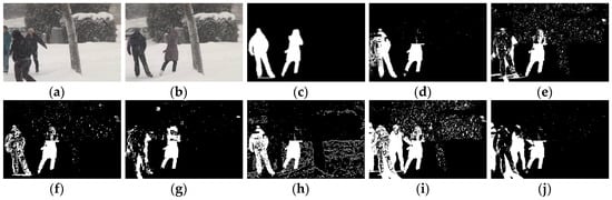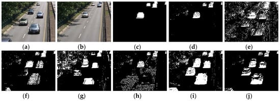 In order to test the detection capability of the algorithms in a complex background environment, we chose to start the initial-background extraction when there were moving objects in the image sequence, using the start image number of selected image sequences shown in Table 3. Figure 7, Figure 8, Figure 9 and Figure 10 show the foreground/background detection results of the seven algorithms under different circumstances, with (a) representing the nth input image (initial image), (b) representing the n + 99th input image, and (c)–(j) representing the ground-truth of the n + 99th input image, as well as the foreground/background detection results of the seven methods, with the white pixels and black pixels representing the foreground and background, respectively.