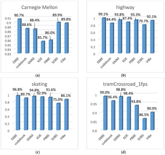 Figure 10 shows the foreground/background detection results obtained by the seven algorithms for one image in the tramCrossroad_1fps sequence, whose dataset only contained ground-truths in the region of interest (non-gray parts) shown in Figure 10c. Since this image sequence was taken at a busy intersection, there were a lot of moving vehicles in the image. The low frame rate also subjected the background to severe color disturbance. A comparison of Figure 10d–j indicated that codebook, KDE, PBBE, and SOBS could not adapt to the background disturbance because of the low frame rate, and thereby incorrectly detected many foregrounds. Moreover, affected by the buses in the initial image, SOBS and ViBe also generated significant ghosting, while both EBBE and GMM had good detection results for this image.