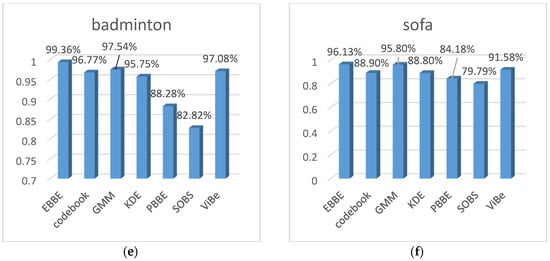 Figure 12 shows the foreground/background detection results obtained by the seven algorithms for one image in the sofa sequence. Since this sequence was captured in a lobby, there were some guests in the image. A comparison of Figure 12d–j indicated that codebook, GMM, KDE, PBBE, SOBS, and ViBe were affected by the slow-moving objects in the sequence and generated significant ghosting. Despite the tiny fragments in the foregrounds detected by EBBE because of the similarity of the guests’ clothing to the background, this method was still the closest to the ground-truth approach among the seven methods.