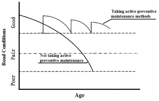 From the viewpoint of maintenance time, scientifically determining the maintenance time can effectively reduce the cost, prolong road life, and improve surface conditions; however, this requires a matched monitoring, data collecting, and analyzing system [14]. Q.Z. Wang summarized the effectiveness and applicability of common pre-maintenance measures, such as fog seal, slurry seal, thin cover and micro-surfacing. Established pavement preventive evaluation systems provided the decision-making basis [15]. C.H. Wang focused on the suitability of pre-maintenance, established an optimization model for timing and countermeasures based on the DEA (Data envelopment analysis) method, and provided a more reliable decision-making solution [16].