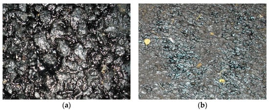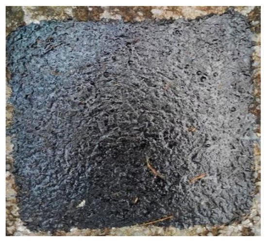 Considering that the penetrant is expensive and produces a slightly irritating odor when it is heated, its hydrolysis reaction with water will affect road beauty, thus its dosage must be controlled. The initial penetrant proportion must be set as 20% of the four components. The mixtures were made according to different ratios and brushed on the road and penetration condition was observed. The results showed that when the rock asphalt and reducing agent mass was above 60%, the solution viscosity was too high. As shown in Figure 3, a thin film formed on the pavement, which hindered the penetration and volatilization process. The film edge tilted and fell off after solidifying, which means a poor maintenance effect and material waste. When the mass was less than 30% the solvent oil dosage was too high, resulting in an excessive volatilization rate that had a negative effect upon maintenance. In summary, the optimum ratio of the rock asphalt and reducing agent should be 30–60%.