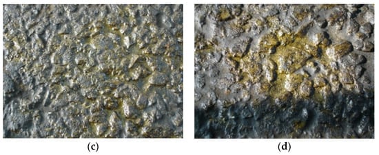 The comparison of the road spraying test. (a) Agent A (black and shiny); (b) Agent B (green and bleeding); (c) Agent D (yellowing and bleeding); (d) Agent E (yellowing and bleeding).