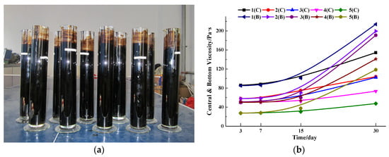 Storage stability contrast test. (a) Storage stability samples; (b) Viscosity contrast results.
