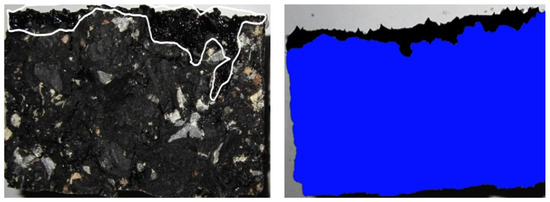 The actual dense gradation asphalt pavement porosity is about 6–7%, which gradually compacts to 3%. We prepared dense graded asphalt mixture specimens by the static pressure method, controlled the porosity under 3, 4, 5, 6, and 7%, then evenly brushed 0.5 and 1 kg/m2 LS pre-maintenance agent and measured the average permeation depth after 0.5, 2, 8, and 24 h. Then we analyzed the relationship of the penetration depth, brushing amount, and penetration time, the digital image method is shown in Figure 6.