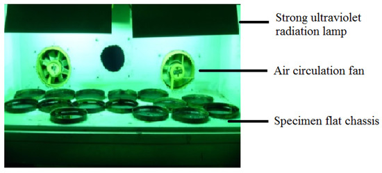 The impact of UV radiation on asphalt pavement is more serious than thermal aging, especially in high altitude areas with strong UV radiation [7,25]; however, natural light aging is a long process, which is not conducive to analyze, therefore, an indoor aging test that simulated and accelerated the natural process was used. By irradiating asphalt specimens with strong UV radiation uninterruptedly and observing the appearance change, we can calculate and compare the UV aging mass loss rate. A self-developed artificial strong UV radiation aging device is shown in Figure 7. It consists of two installed 1000 W strong UV lamps on top, two air circulation fans that are set to simulate the ventilation environment, and a ø140 mm × 9.5 mm flat disc that holds the sample.