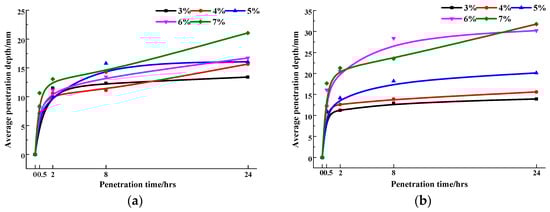 The comparison of average penetration depth. (a) 0.5 kg/m2; (b) 1 kg/m2.