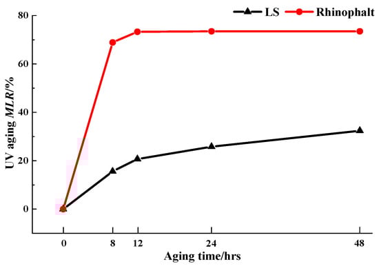 From Figure 9, the MLR of the LS pre-maintenance agent was obviously less than the Rhinophalt, moreover, its trend was more stable; after 48 h it reached 32.4%. The results of the Rhinophalt changed fast within 8 h and stabilized after 12 h, finally reaching 73.5%.