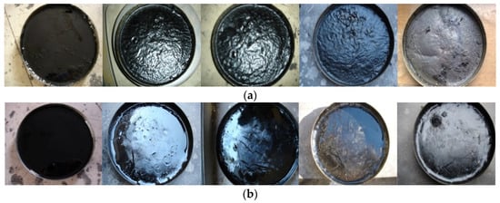 As shown in Figure 10, the two materials were all black liquid before aging and their surfaces were smooth and consistent. For the LS pre-maintenance agent, the surface formed thin film with slight wrinkles after 8 h, the folds were further deepened with slight cracks after 12 h, the film shrunk, lower liquids became harder and brittle after 24 h, and the surface completely hardened after 48 h. For Rhinophalt, on the specimen appeared small holes and the material continuously reduced and began to harden after 8 h. The crack appeared after 12 h. The specimen was completely hardened and had lost its consistency and viscosity after 24 h.
