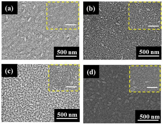 Because of the poor wettability of Ag nanofilms on silicon substrates, a large number of voids and gaps exist in the ultrathin Ag nanofilms created using physical sputtering fabrication methods, and thus the photothermal effects can be relatively large [17]. As shown in Figure 1a,b, Ag nanofilms with a large number of voids and gaps segregated and conglobated together within a short time period (about 15 min) under light illumination. Reference test samples covered with Al foil (thickness 1 mm) are provided in the insets framed by the yellow dotted line. The Al foil-covered samples here can reflect the light and maintain a similar temperature as the samples under light illumination. Interestingly, the conglobations of Ag nanofilms with thicknesses below 10 nm display mutual bonding under light that is different from the characteristics of the sample under the cover. As a result, the average particle size of the Ag nanoparticles counted using ImageJ were much larger than without the light illumination when the thickness of the Ag nanofilms was below 10 nm, as shown in Figure 2a,b. As the thickness of the Ag nanofilm was increased to 20 nm, the light-induced conglobation of the Ag nanofilms exhibited an increase in the size of the voids and gaps in the sample. As shown in Figure 1c, the conglobation of the Ag nanofilms occurs at the voids and gaps—the light-induced conglobation is much larger than that induced only with the heat treatment in the reference tests. The results show clearly that the energy provided by the light illumination is not sufficient for the thorough conglobation of the Ag nanofilms into Ag nanoparticles on the silicon substrate when the thickness of the Ag nanofilms was increased to 20 nm. When the thickness was further increased to 30 nm, the Ag nanofilms became continuous films, with few voids or gaps observable. As shown in Figure 1d, few distinct conglobations occur on the 30-nm-thick Ag nanofilms via either light illumination or heat treatment below 140 °C.