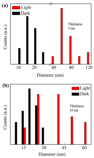 Statistical results of the diameters of Ag nanoparticles generated by Ag nanofilms with and without light illumination; (a) Ag nanofilms with thickness 5 nm; (b) Ag nanofilms with thickness 10 nm.