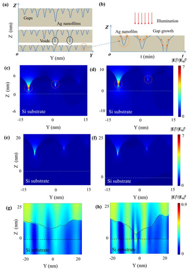Voids induced plasmonic enhancement on Ag nanofilms with various thicknesses; (a) schematic diagram of voids in Ag nanofilms with various thicknesses; (b) schematic diagram of the evolution of gaps/voids in Ag nanofilms with light illumination; (c–f) plasmonic enhancement of gaps/voids on Ag nanofilms with 6 nm, 10 nm, 20 nm and 25 thicknesses; (g), (h) plasmonic enhancement of surface fluctuations on Ag nanofilms (thickness 10 nm) with average ±2 nm and ±4 nm.