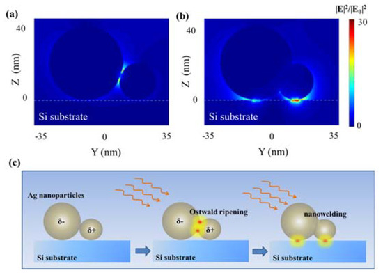 Plasmonic welding of Ag nanoparticles; (a) light enhancement of Ag nanoparticles (diameters 40 nm and 20 nm) in contact; (b) light enhancement of merged Ag nanoparticles; (c) schematic diagram of the plasmonic nanowelding of Ag nanoparticles.