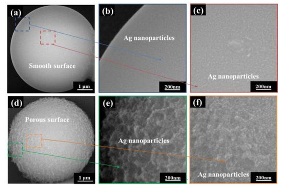 Light-induced conglobation of Ag nanofilms on carbon spheres with smooth and porous surfaces. (a) Low-magnification image of Ag nanoparticles on carbon spheres with smooth surfaces; (b,c) surface morphologies of carbon sphere in the margin and center; (d) low-magnification image of Ag nanoparticles on carbon spheres with smooth surfaces; (e,f) surface morphologies of carbon sphere in the margin and center.