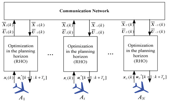 In the framework of distributed receding horizon optimization, as shown in Figure 3, at time k, each UAV Ai receives the planned control inputs and the trajectories from the other UAVs. Then Ai optimizes its control inputs and plans its own trajectory based on the estimates of the target state and the future state predictions of the other UAVs. Ai also can share the optimal control inputs and the planned trajectory with the other UAVs. Thus, the distribution optimization is performed in a specific order [25]. For example, An plans its trajectory based on the trajectories of the previous (n − 1) aircrafts (A1 ~ An−1) and then sends its trajectory to aircraft An+1.