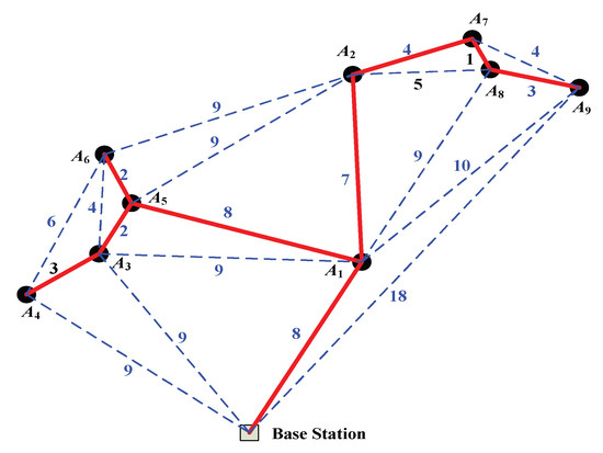 For the entire multiple UAV system, to ensure that all the UAVs and the base station relate to the highest successful transmission probabilities, the concept of the minimum weighted spanning tree (MST) [26] from graph theory is used to determine the topology of the communication network. Figure 4 shows an example communication topology and its minimum weighted spanning tree. The base station is the root node that directly or indirectly connects to all the other nodes (the UAVs). The MST must connect all nodes with the condition that the sum of the weights is minimized. Thus, the overall probability of a message “floating” in the MST network is maximized.