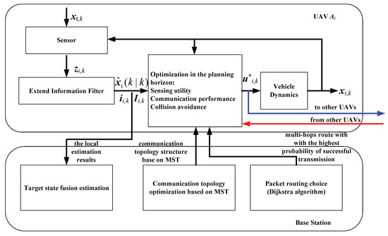 The block diagram in Figure 5 summarizes the cooperative target tracking algorithm based on the co-optimization of communication and sensing. At each time k, first, according the positions of UAVs and the base station, the weighted minimum spanning tree strategy is used to optimize the communication network topology. Based on the MST communication topology, the Dijkstra algorithm is used to find the route with the highest successful transmission probability between each UAV Ai and the base station. Next, all the UAVs are sorted in the ascending order of the total number of hops to the base station as described in the previous section. The UAVs successively perform the local optimization calculation according to the sorted results. Next, each UAV Ai uses an EIF to obtain the local estimation results of the target state. The local information terms ii,k and Ii,k, which are generated based on the measurement zi,k of the target, are summed at the base station to produce a global estimation. Ai then computes its own trajectory based on the planned results of Aj, which is the relay of Ai in the current MST communication topology. In distributed fashion, each UAV Ai solves the local optimization problem in Equation (42) to obtain the optimal control sequence u*i, k during a planning time horizon TP. Finally, the control input in the sequence is implemented, Ai changes its flight state xi,k, and obtains a new measurement zi,k of the target restarting the cycle.